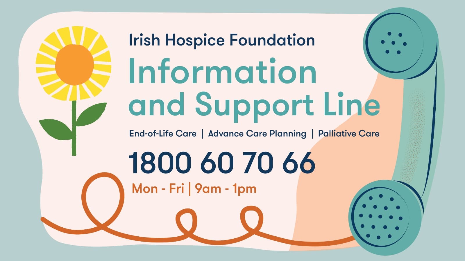 Facing or caring for a friend or family member with a life-limiting illness can be both a challenging and uncertain time for anyone. The Information and Support Line is a confidential line that provides signposting, practical supports and resources about end-of-life care in Ireland. It is important to note that the Information and Support Line is not a medical, emergency or crisis service. The Information and Support line is available on freephone 1800 60 70 66 from 9am – 1pm, Monday to Friday (excluding bank holidays and other holiday periods). You can also email queries to support@hospicefoundation.ie.