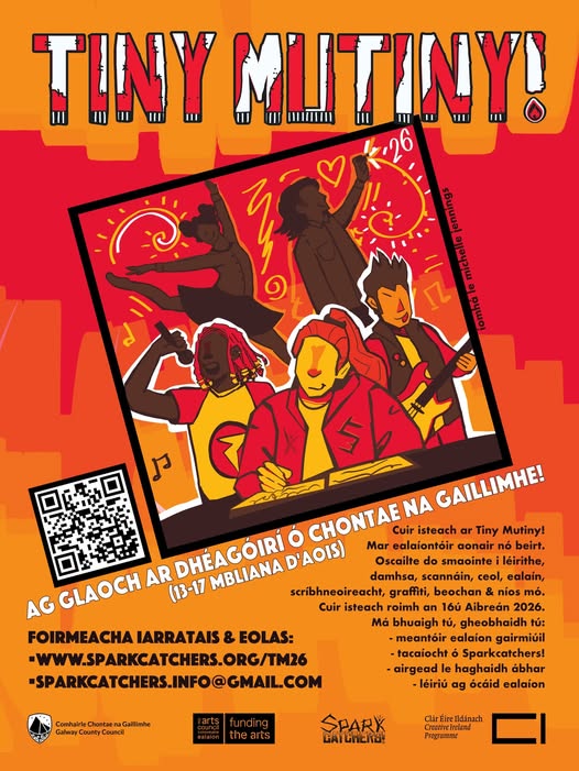 Spriocdháta: Déardaoin an 16 Aibreán 12meán lae Ag glaoch ar dhéagóirí ó Chontae na Gaillimhe (13-17 mbliana d'aois) Cuir isteach ar Tiny Mutiny! Mar ealaíontóir aonair nó beirt. Oscailte do smaointe i léirithe, damhsa, scannáin, ceol, ealaín, scríbhneoireacht, graffiti, beochan & níos mó. Foirmeacha iarratais: Apply '26 Tiny Mutiny! — Sparkcatchers! Ríomhphost ceisteanna ar bith: sparkcatchers.info@gmail.com