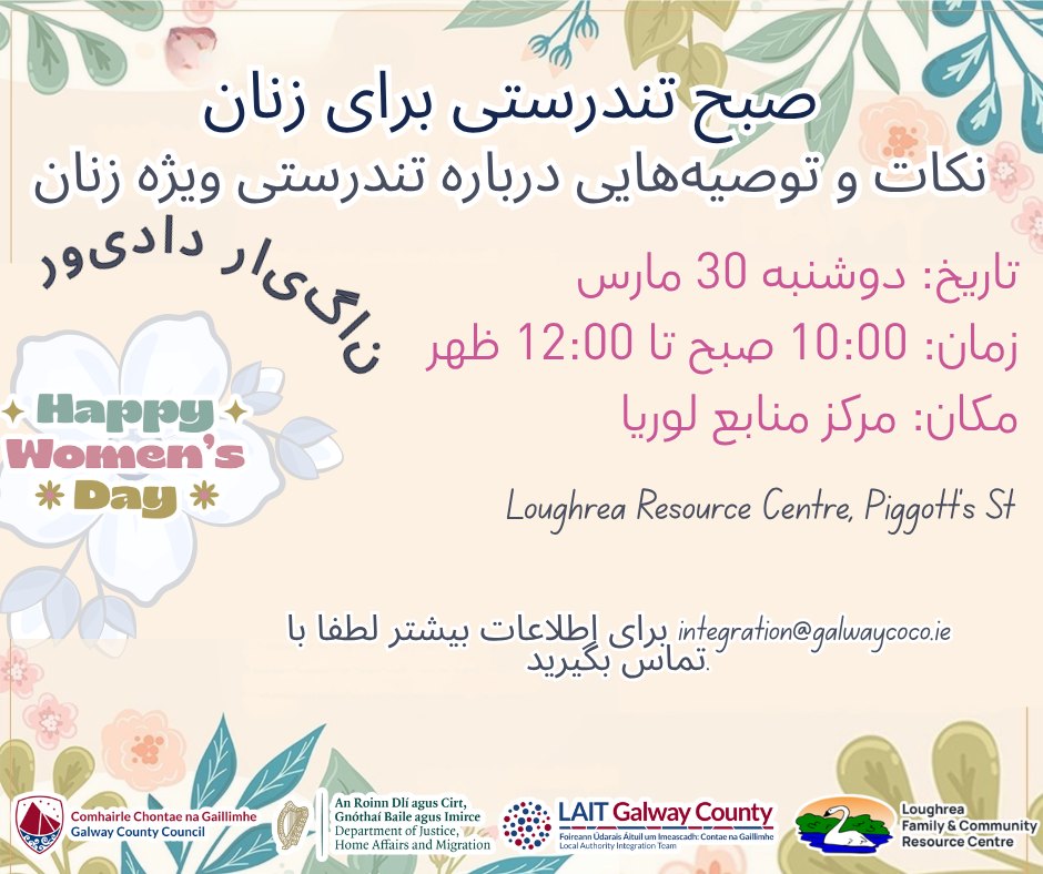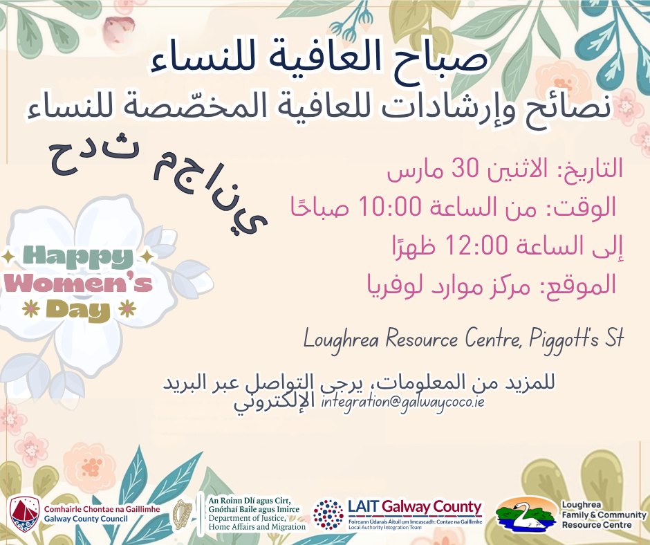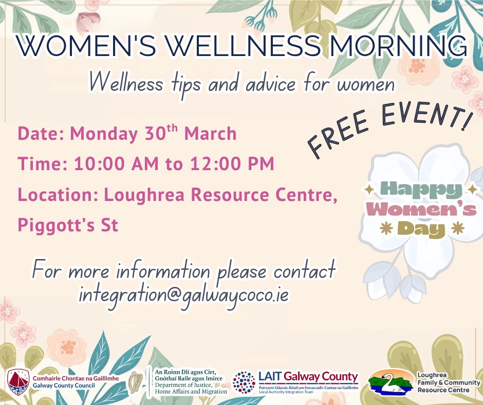 Monday 30th March 2026 from 10am to 12pm - Loughrea Resource Centre, Co. Galway The Women’s Wellness Morning will take place this coming Monday 30th from 10am to 12pm at Loughrea Resource Centre. Come along for FREE advice and demonstrations! For more information, please contact integration@galwaycoco.ie