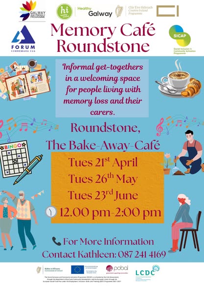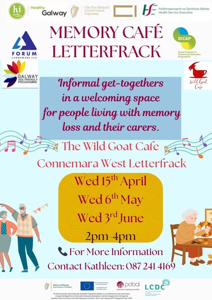 Letterfrack – The Wild Goat Café, Wednesdays 15th April, 6th May, 3rd June 2pm - 4pm Roundstone – The Bake Away Café, Tuesdays 21st April, 26th May, 23rd June 12pm - 2pm Informal, welcoming meet‑ups are taking place in Letterfrack and Roundstone for people living with memory loss and their carers. These cafés offer a relaxed space to chat, connect, and enjoy time together in a supportive community setting. For more information, contact Kathleen: 087 241 4169.