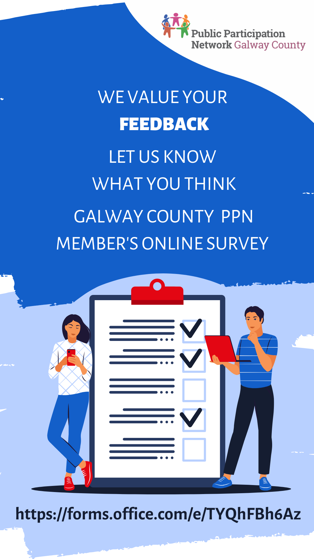Dear PPN Members, we need your help!! Galway County Public Participation Network (PPN) is conducting a survey among its members to help us better understand and support our member groups. To achieve this, the survey focuses on identifying the current activities, challenges, and specific needs of the organizations that are part of the PPN. What would you like to see from your PPN? How can we help you achieve this? Do you require upskilling courses, help with getting information about your organisation out to the public? Please let us know by completing this survey. Galway County Public Participation Network (PPN) - Member's Survey here: https://forms.office.com/e/TYQhFBh6Az Please share the Survey with everyone in your PPN Member Group.
