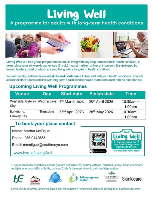 Starting Thursday 23rd April 2026 from 10:30am to 1pm Ballybane, Galway City Living Well Programme coming to Westside in March. This is a free group programme aimed to help people manage their long-term health conditions and improve their wellbeing. Anyone with any chronic illness such as diabetes, arthritis, COPD, cardiac illness, anxiety, etc. can benefit from these workshops. The programme will be delivered by trained facilitators once a week, over a 6-week period in a friendly and supportive setting. Contact Martha McTigue 086 014 2688
