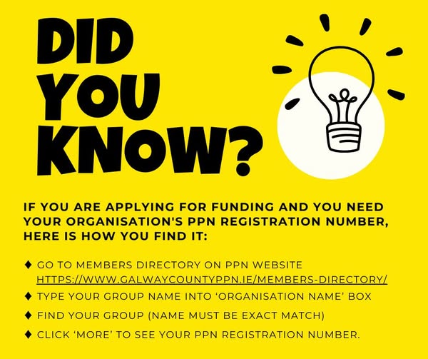 If you need to know your Organisation's PPN Registration Number to apply for funding and grants, (this is a requirement for some Local Authority funding) here is how you find it: ♦ Go to Members Directory on PPN website https://www.galwaycountyppn.ie/members-directory/ ♦ Type your group name into ‘Organisation Name’ box ♦ Find your Group (name must be exact match) ♦ Click ‘More’ to see your PPN registration number.