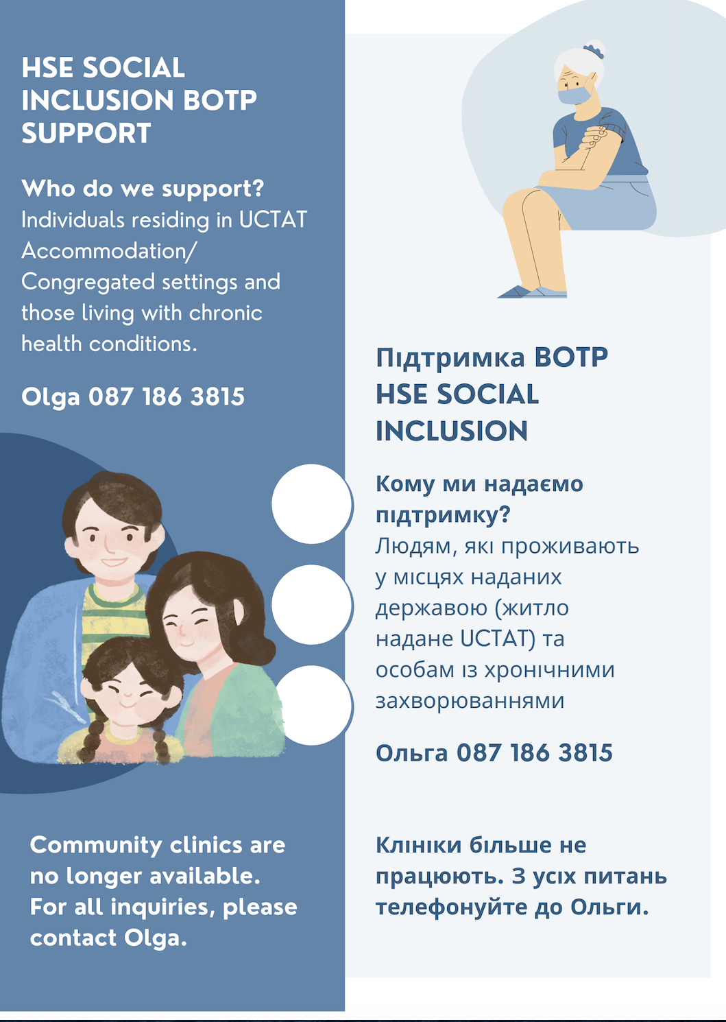 Support for individuals residing inUCTAT Accommodation/Congregated settings and those living with chronic health conditions. For all inquires, please call Olga 087 186 3815