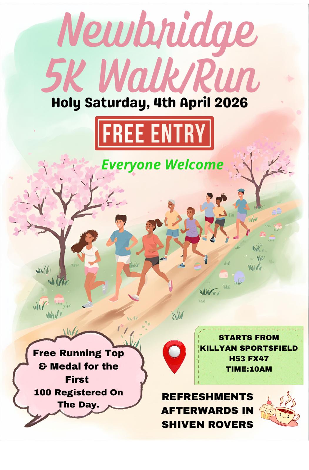 Holy Saturday 4th April 2026 at 10am Newbridge 5K Fun Run/Walk on Holy Saturday 4th April 2026. Starting at Killyan Sportsfield Eircode H53 FX47: Time 10 am. Refreshments after in Shiven Rovers Club House. Eircode H53 NP70 Open to all – Free Event.