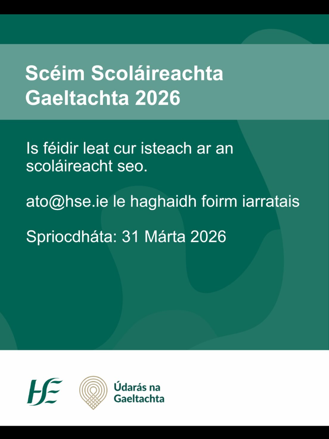 Spriocdháta: Dé Máirt 31 Márta 2026 Cuireann Feidhmeannacht na Seirbhíse Sláinte (FSS) i gcomhpháirt le hÚdarás na Gaeltachta scolaireachtaí ar fáil d’fhochéimithe Gaeltachta atá ag tabhairt faoi staidéar ar chúrsaí tríú leibhéal a bhaineann le sláinte (m.sh leigheas, teiripe shaothair, fisiteiripe, nó teiripe urlabhra agus teanga). Bhunaigh FSS agus Údarás na Gaeltachta an Scéim Scoláireachta Gaeltachta d’fhonn tacú le mic léinn Ghaeltachta agus seirbhísí cúraim sláinte trí Ghaeilge a neartú fré chéile. Má bhíonn aon cheist faoin Scéim is féidir teagmháil a dhéanamh linn ag pleanailteanga@udaras.ie nó leis an FSS ag ato@hse.ie