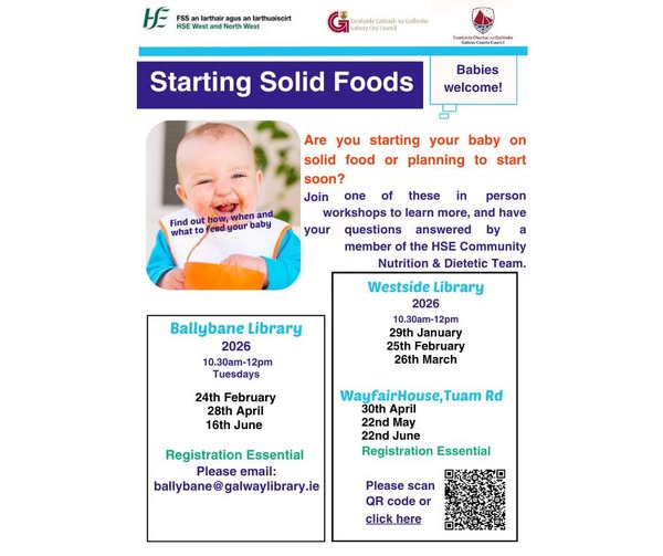 Next dates coming up: Tuesday 28th April 2026 10.30am - 12pm Ballybane Library Thursday 30th April 2026 10.30am - 12pm Wayfair, Wayfair House, Tuam Rd, Galway H91 W260 Thinking about starting your baby on solid foods? Join one of our upcoming workshops for reliable advice and support from the HSE Community Nutrition & Dietetic Team. Whether you're a first-time parent or looking for some fresh ideas, these events are perfect for getting tips and tricks on introducing solids to your little one. The experts will share practical advice, answer your burning questions, and provide resources to make this transition as smooth as possible. To check more dates available and to register, please click here