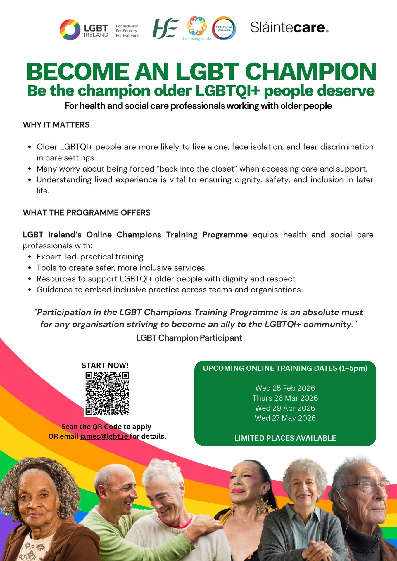 Next dates coming up: Wednesday 29th April, Wednesday 27th May - Online from 1pm to 5pm LGBT Ireland has just confirmed the first new dates for 2026 for the LGBT Champions Programme. LGBT Ireland’s Online LGBT Champions Training Programme supports health and social care professionals to provide safer, more inclusive care for LGBTQI+ older people. Older LGBTQI+ people are more likely to live alone, experience isolation, and fear discrimination in care settings. Many worry about being forced “back into the closet” when seeking support. The Champions Programme offers practical, evidence-informed training and resources to help services respond with dignity, confidence, and respect. People can apply by: Scanning the QR code on the attached poster, completing the online application here: https://docs.google.com/.../1FAIpQLSc7cHJ8UlPLXw.../viewform or emailing james@lgbt.ie for more information