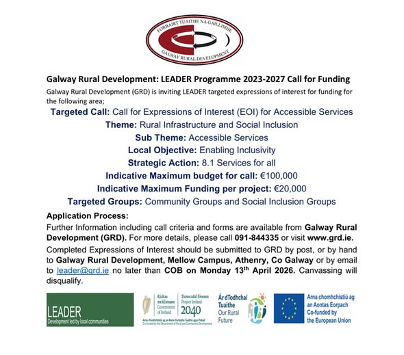 Closing date: Monday 13th April 2026 Galway Rural Development (GRD) is inviting LEADER targeted expressions of interest (EOI) for funding for Accessible Services Projects. Indicative maximum budget: €100k. Maximum funding: €20k per project. For more information, please call 091 844 335 or visit LEADER Programme — Galway Rural Development