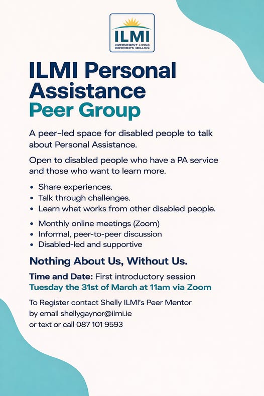 First Introductory Session: Tuesday 31st March 2026 at 11am - Online via Zoom This is a peer-led space for disabled people to talk openly about Personal Assistance, What works, what’s challenging, and how we support each other. Open to disabled people who have a PA service and those who want to learn more. ♦ Monthly Zoom meetings ♦ Informal, peer-to-peer discussion ♦ Disabled-led and supportive To Register and get the Zoom link contact Shelly ILMI’s Peer Mentor by email shellygaynor@ilmi.ie or text or call 087 101 9593