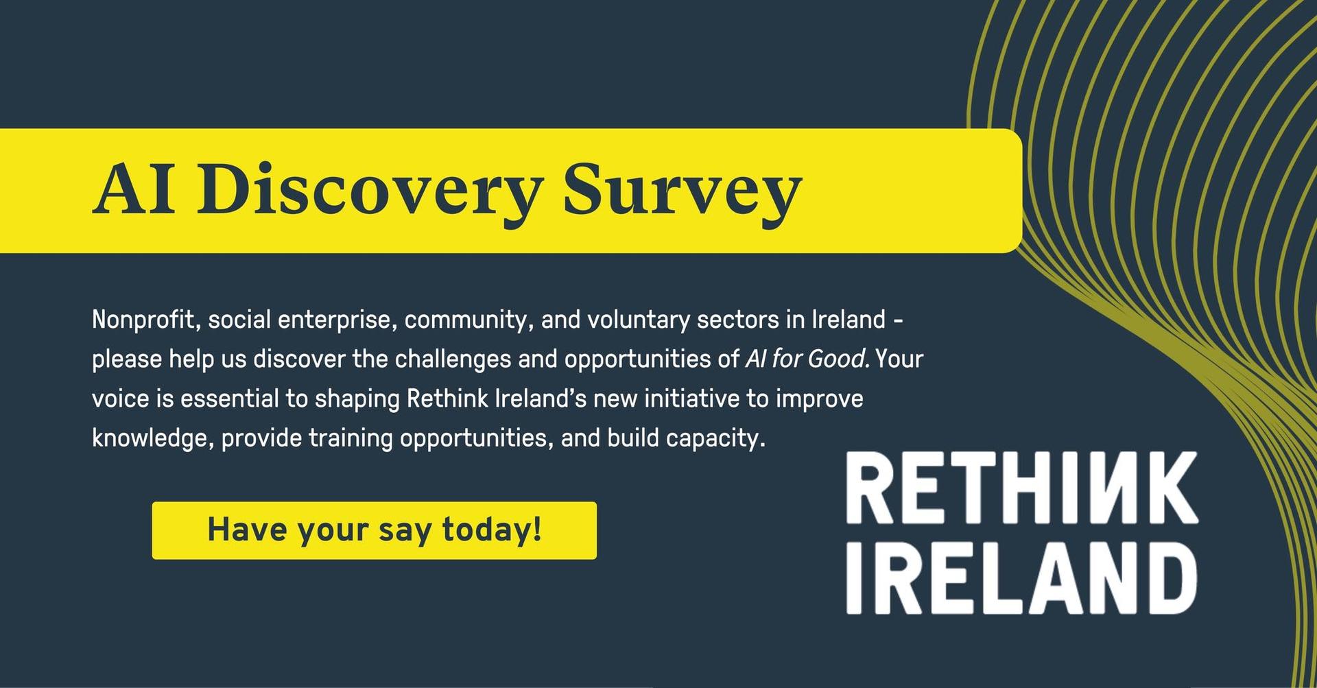 Closing date: Wednesday 15th April 2026 Rethink Ireland is developing a new capacity-building initiative (AI for Good Fund) to empower the nonprofit, social enterprise, community, and voluntary sectors in Ireland. To make sure this work truly supports the sector, they would love to hear from you. They are inviting workers and volunteers to complete a (brief) AI Discovery Survey (approx. 5 minutes). The survey is available in both English and Irish, and open for responses till April 15. Your invaluable insights will help shape how AI can be harnessed in ethical, inclusive, and impactful ways. Here’s the link: English: AI Discovery Survey Irish: Suirbhé Follasaithe IS