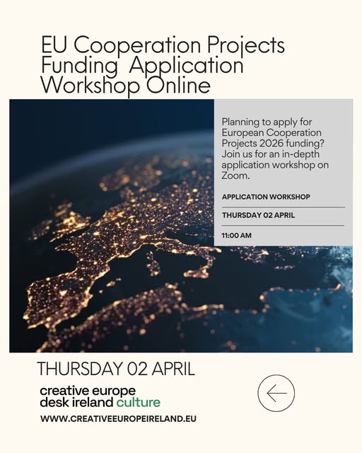 Application Workshop: Thursday 2nd April 2026 at 11am - Online Closing date: Tuesday 5th May 2026 Planning to apply for European Cooperation Projects 2026 funding? Join us on Thursday 2 April for an in-depth application workshop. We will go through the application process and online forms for the Creative Europe call for European Cooperation Projects funding 2026. With a budget of around €60 million, European Cooperation Projects funding will foster cooperation between organisations active in the field of culture, increasing the cross-border dimension of creation and circulation of European artistic content. It will also encourage the development, experimentation, dissemination, and application of new and innovative practices. This funding action is expected to support around 150 projects. The deadline for EU Cooperation Projects funding is 5 May 2026. Register for Zoom webinar: Meeting Registration - Zoom