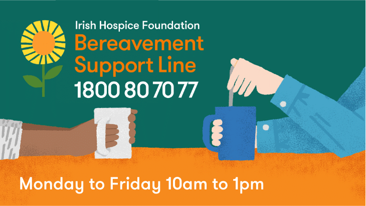 No-one has to grieve alone. Our Bereavement Support Line is here to provide comfort and support. If you are grieving or worried about someone else who is, call Freefone 1800 80 70 77, available Monday to Friday 10am to 1pm. This service offers a confidential space for individuals to discuss their grief or ask questions related to the death of someone they care about. The service aims to provide comfort and emotional support, and any information shared is kept confidential unless necessary for safeguarding reasons. For more info, please visit Bereavement Support Line - Irish Hospice Foundation