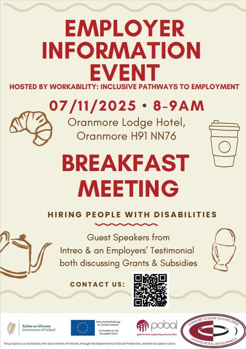 Friday 7th November 2025 8am - 9am Oranmore Lodge Hotel Galway Station Road Oranmore H91NN76 WorkAbility GRD are hosting a free breakfast event for employers to get information on supporting current/ future staff with disabilities. This event is an opportunity for you to learn about employing someone with a disability, focusing on the grants and subsidies available to you.To register for the event, please book through: https://www.eventbrite.ie/e/employer-event-supporting-people-with-disabilities-tickets-1851130644589?
