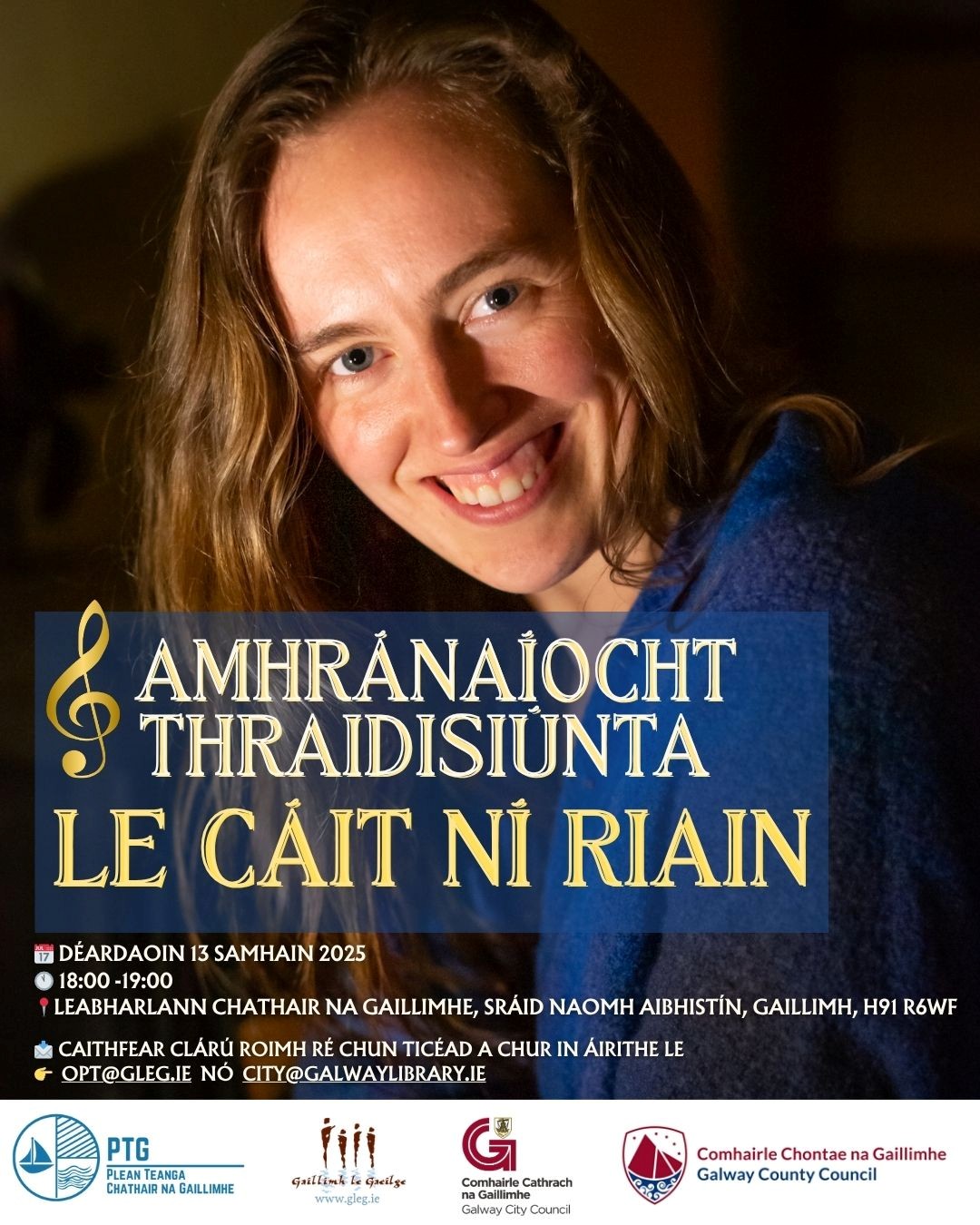 Déardaoin an 13ú Samhain ag 18.00 i Leabharlann Chathair na Gaillimhe, Sráid Naomh Aibhistín Beidh Amhránaíocht Thraidisiúnta le Cáit Ní Riain ar siúl tráthnóna Déardaoin an 13ú Samhain ag 18.00 i Leabharlann Chathair na Gaillimhe, Sráid Naomh Aibhistín, Gaillimh, H91R6WF. Cuir do thicéid in áirithe ag opt@gleg.ie nó city@galwaylibrary.ie