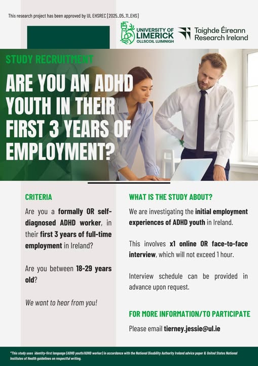 University of Limerick and Research Ireland Study: ADHD Youth & Employment Research. This study aims to explore and describe ADHD youths’ (18-29 years old) initial employment experiences, and the perceptions of key stakeholders involved in Ireland. Who can participate? • ADHD Youth (both self-diagnosed and formally diagnosed),• Between 18-29 years old, • In their first 3 years of employment. For more information and to participate please email: tierney.jessie@ul.ie