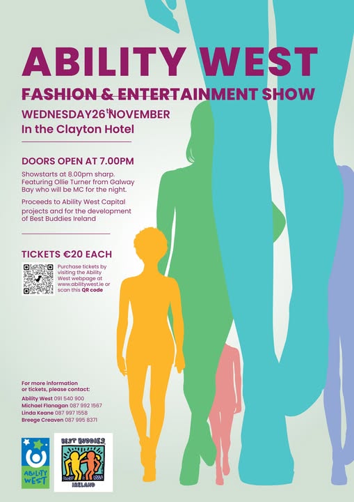 Wednesday 26th November 2025 Show starts at 8pm sharp - The Clayton Hotel, Galway City Join us for a night filled with style, talent, and entertainment. The event will be hosted by the always entertaining Ollie Turner, ensuring plenty of fun and laughter throughout the evening. Tickets are €20 each and can be purchased online at https://ability-west.sumupstore.com/, or by contacting the numbers listed on the event poster, online purchases can be collected at the door on the night. See the event page here: https://fb.me/e/7aYMScPB0