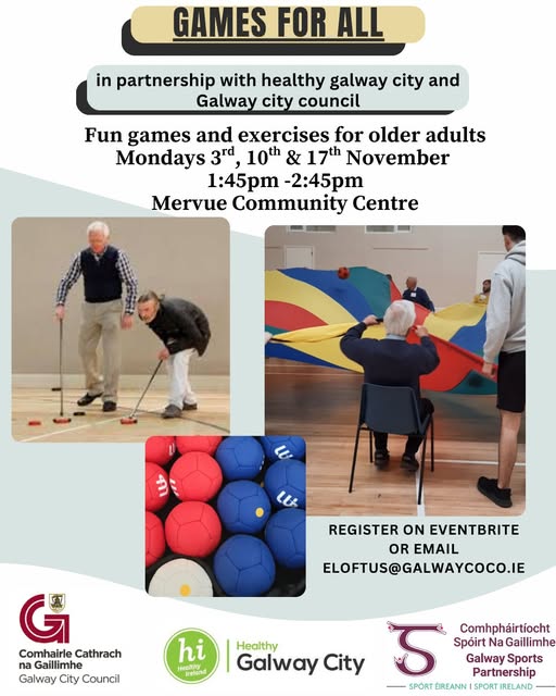 Mondays 3rd, 10th and 17th November 2025 1:45pm - 2:45pm Mervue Community Centre, Galway Join Galway Sports Partnerships tutor Laura for some fun social games over 3 weeks! Laura will take you through various activities such as Boccia, Scooch, Skittles and Cornhole. This is a 3 week trial program for an 8-week program starting at the end of January - come along and give the games a try. Bring along a friend and a bottle of water! Email eloftus@galwaycoco.ie for queries Free of Charge, registration is essential: https://www.eventbrite.ie/.../games-for-all-mervue...