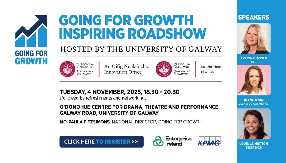 Tuesday 4th November from 6.30pm - 9pm - O'Donoghue Centre, University Road Galway H91 T8WR The aim of this event is to inspire enterprising women—regardless of where they are on their entrepreneurial journey—to be ambitious for their businesses. The event will also highlight the wide range of supports available across the ecosystem, including Going for Growth, LEO Start Your Own Business, New Frontiers, and more. Book now at https://loom.ly/ldT8H2k