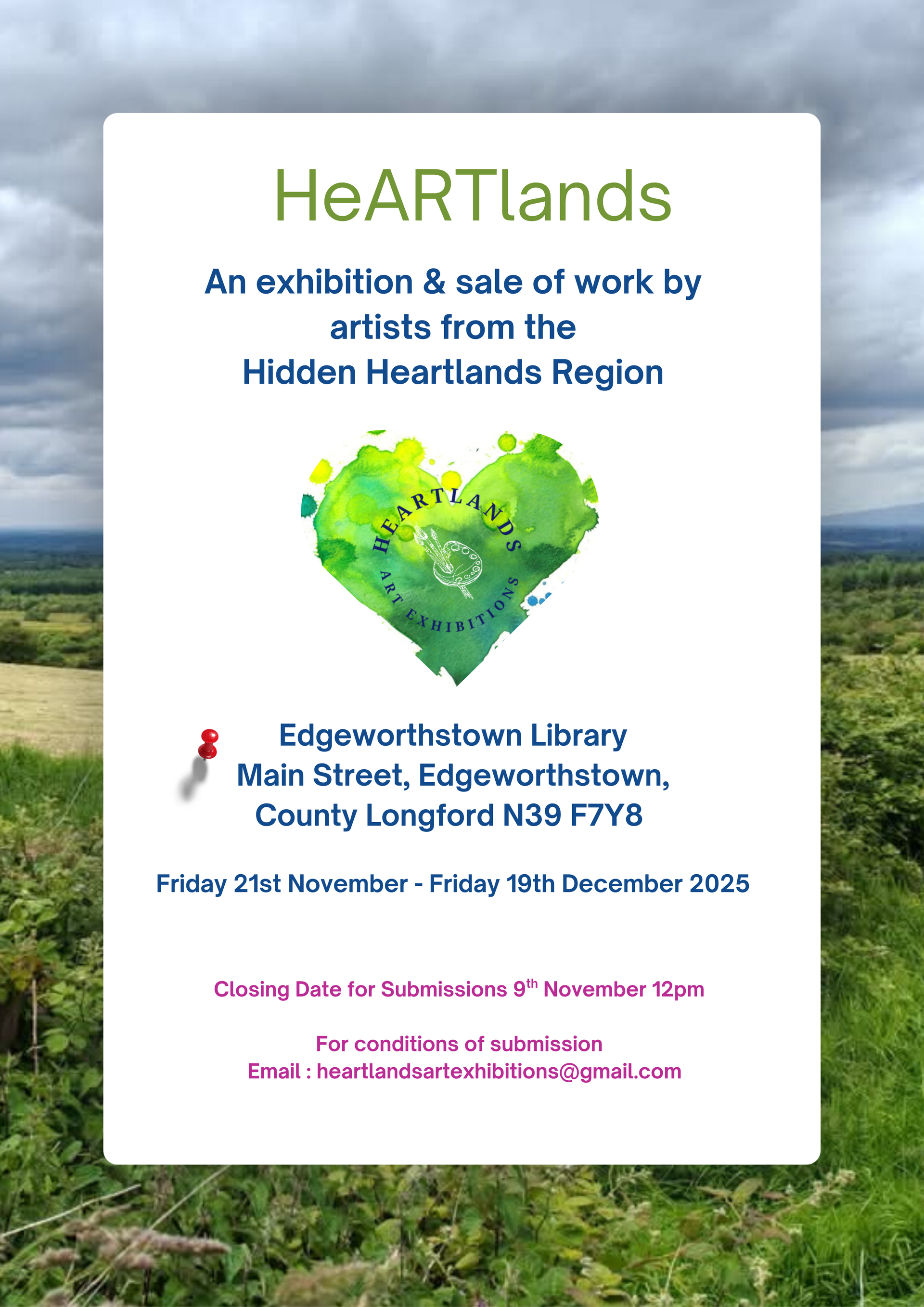 Closing date for submissions: Sunday 9th November 2025 at 12pm From Friday 21st November until Friday 19th December 2025 Edgeworthstown Library Co. Longford Heartlands Art Exhibitions to be held in Edgeworthstown Library from Friday 21st November until Friday 19th December. Call for submissions is open until 9th November at 12pm. The exhibition and sale of work is open to professional, emerging and otherwise passionate visual artists living and working in Irelands Hidden Heartlands Region. Any further information see Anna D. Atkinson heartlandsartexhibitions@gmail.com or connect via mobile at 087 7807118.