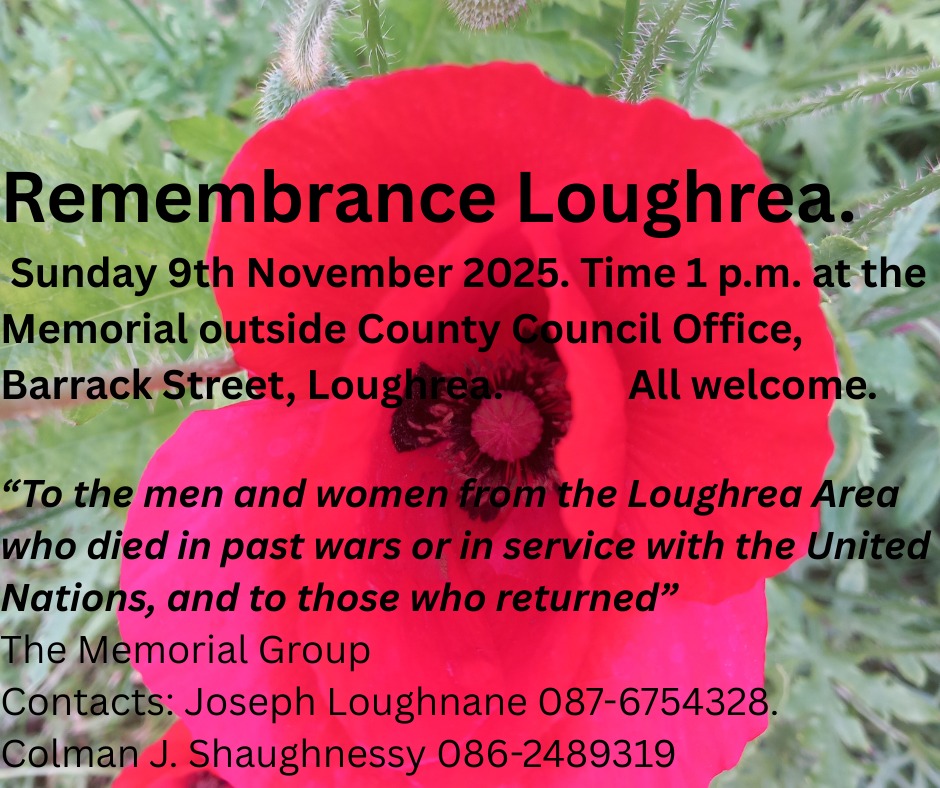 Sunday 9th November 2025 1:00pm Memorial outside County Council Office, Barrack Street, Loughrea Contacts: Joseph Loughnane 087 Colman J. S