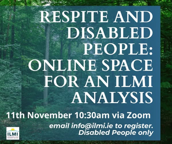 Tuesday 11th November 10:30am Online via ZOOM ILMI needs to build a clear analysis on the role of respite in the lives of disabled people in light of the implementation of the UNCRPD. There is a commitment in the National Human Rights Strategy for Disabled People 2025 to 2030 to “Increase availability of respite places and broaden the spectrum of respite provision in supporting disabled people and their families”. As a Disabled Persons Organisation (DPO) it is vital to have an informed, collective discussion on what the lived experience of Disabled People is and has been in accessing respite. The purpose of this discussion is to enable disabled people to share their lived experience of respite, what they experience was like, their reasons for accessing respite and what role respite could play for Disabled People. If you want to be involved email info@ilmi.ie to register.