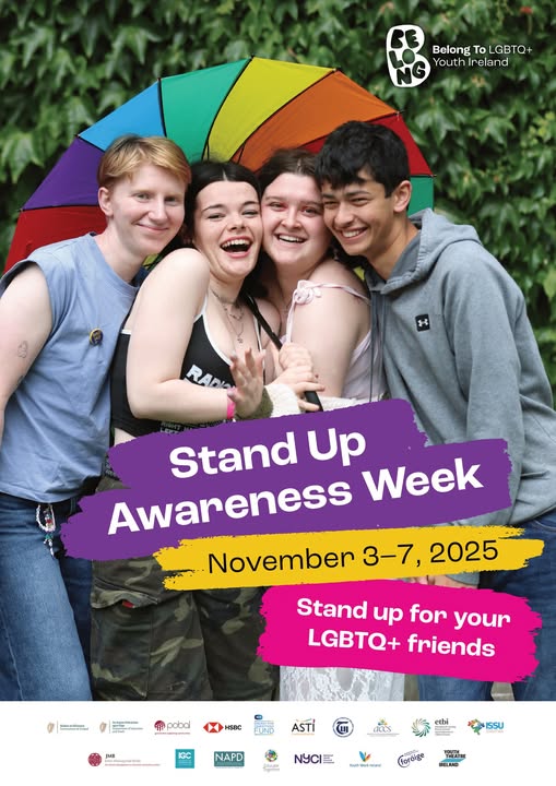 From Monday 3rd to Friday 7th November 2025 Belong To’s Stand Up Awareness Week is a time for post-primary schools, youth services and Youthreach centres in Ireland to join us and take a stand against homophobic, biphobic and transphobic bullying. The week is an opportunity to take steps to make spaces welcoming and inclusive for LGBTQ+ young people. We will equip you with the resources, tools and knowledge needed to host Stand Up Awareness Week in your school, youth service or Youthreach at any time that works for you. If your school is interested in taking part, you can download a resource pack or find out more information at https://www.belongto.org/standup/