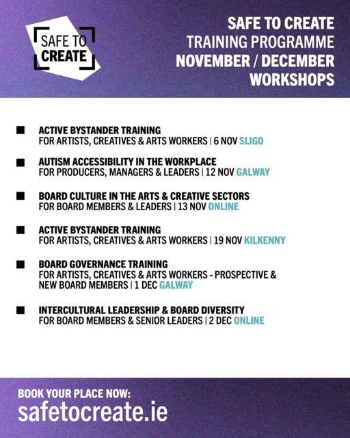 Starting on Thursday 6th November 2025 Safe To Create November & December workshops are open for bookings and include workshops in Galway, Sligo, and online. These workshops are designed to strengthen your knowledge, build practical skills, and equip you with the tools to thrive in your workplace. All workshops are subsidised, with places offered either free of charge or at a modest cost. To support participation, travel and accommodation bursaries are available for those living outside the host city (Ireland residents), along with access cost support to help ensure everyone can take part fully. Book now at https://loom.ly/cGsn3Bg