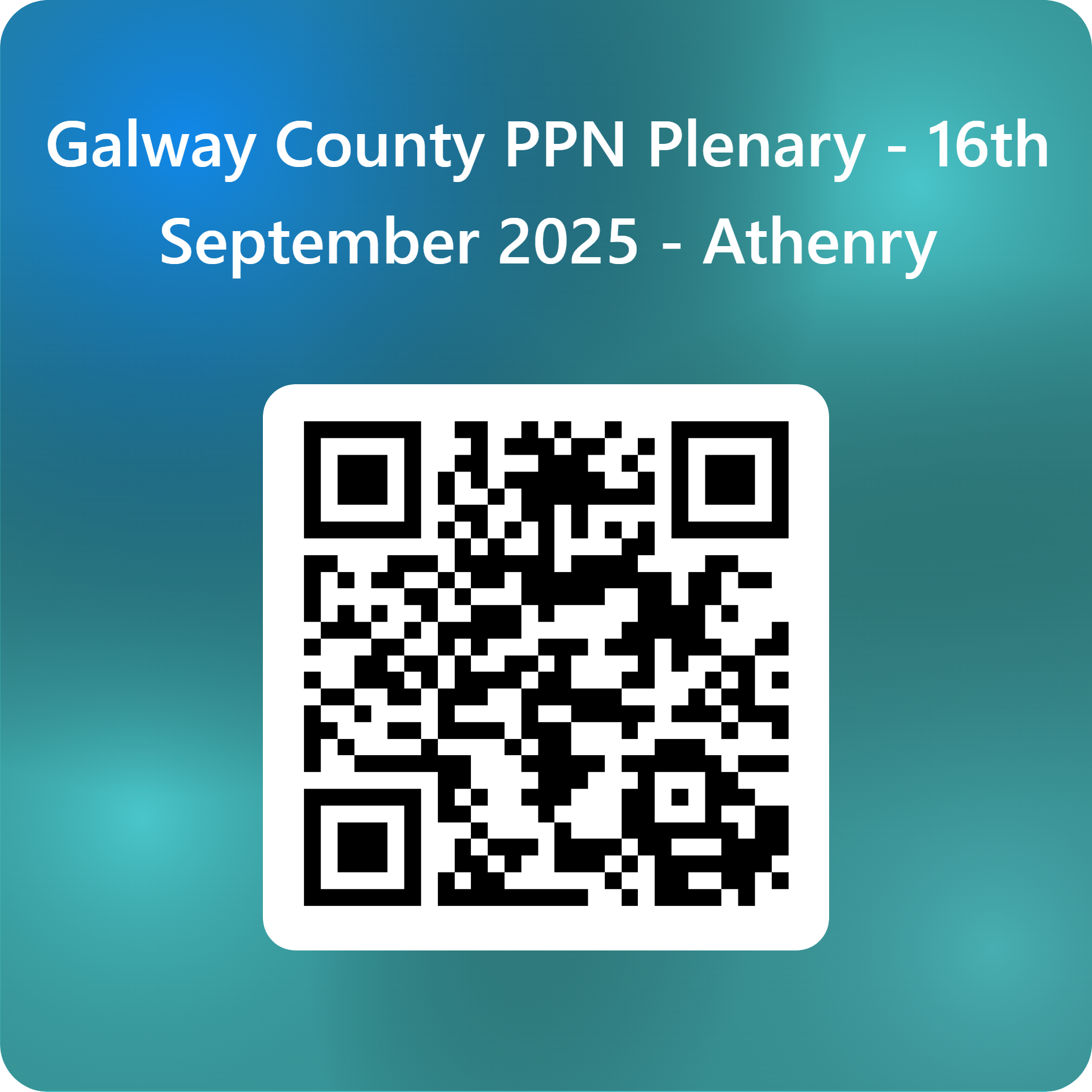 Dear PPN Members, Galway County Public Participation Network (PPN) Staff and Secretariat Committee would like to thank the public who attended the PNN Plenary meeting last September in Athenry. For those who did not complete the survey at the Plenary, you can complete it now by scanning the QR code above or at the following link: Galway County PPN Plenary Event – 16th September 2025 | Galway County PPN Your feedback is very important to us! Thank you!!