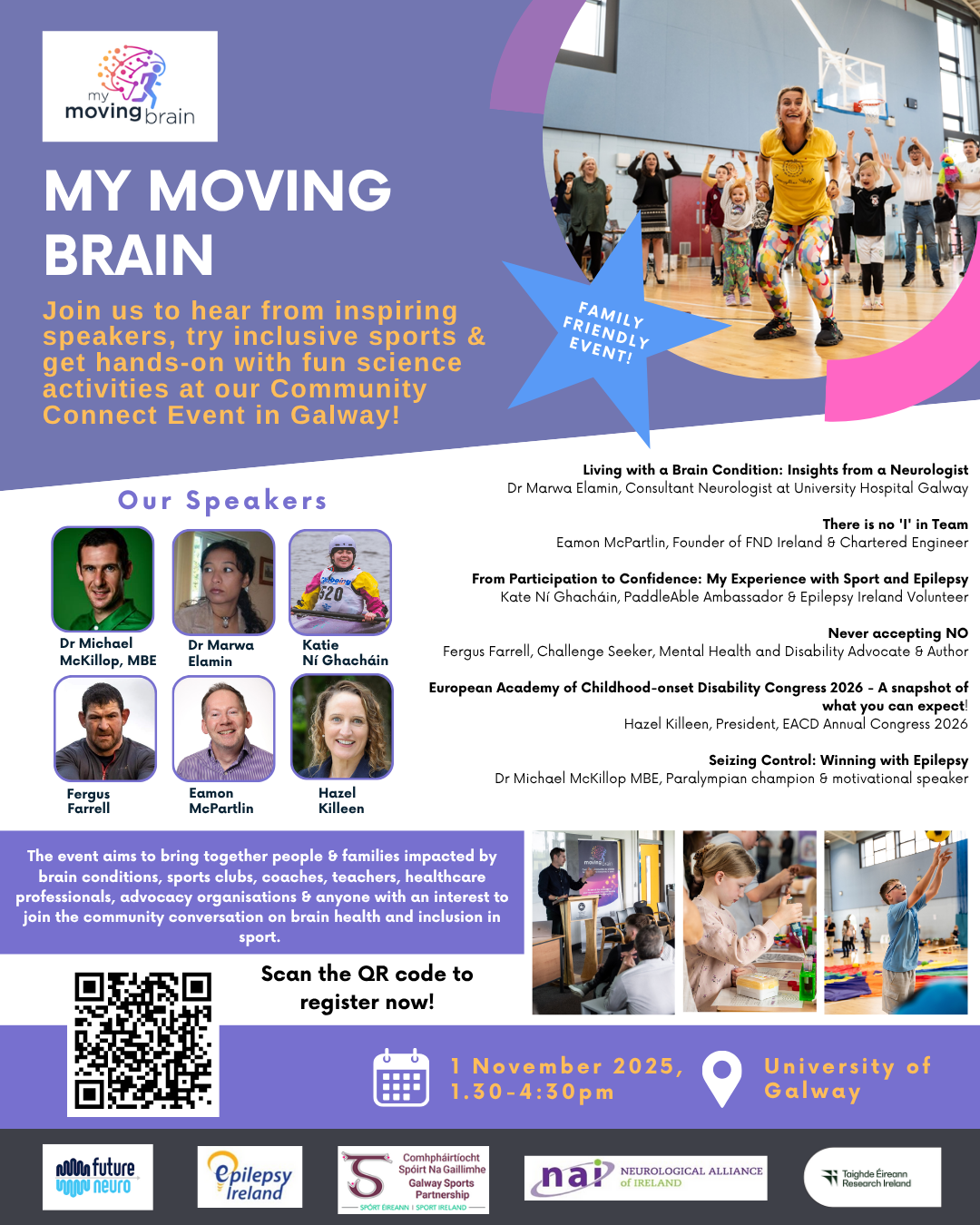 Saturday 1st November 2025 from 1:30pm to 4:30pm O'Donoghue Centre for Drama, Theatre and Performance, University Road H91 T8WR Galway My Moving Brain, a community-led event from the FutureNeuro Research Ireland Centre, aims to spark important conversations around brain health and inclusion in sport for people living with brain conditions. The event brings together individuals with lived experience, their families, researchers, sports leaders, and advocacy groups to explore barriers to participation and identify practical solutions. As Ireland’s leading centre for translational brain science, FutureNeuro focuses on conditions including epilepsy, motor neurone disease, multiple sclerosis, Parkinson’s disease, traumatic brain injury, neurodevelopmental conditions, and psychosis. Register here: My Moving Brain: Community Connect Event in Galway Tickets, Sat, Nov 1, 2025 at 1:30 PM | Eventbrite