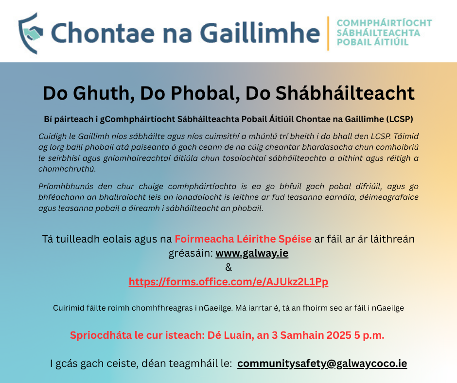 Spriocdháta: Dé Luain, an 3 Samhain 2025 5 i.n. Bí páirteach i gComhpháirtíocht Sábháilteachta Pobail Áitiúil Chontae na Gaillimhe (LCSP). Tá tuilleadh eolais agus na Foirmeacha Léirithe Spéise ar fáil ar ár láithreán gréasáin www.galway.ie & https://forms.office.com/e/AJUkz2L1Pp . Cuirimid fáilte roimh chomhfhreagras i nGaeilge. Má iarrtar é, tá an fhoirm seo ar fáil i nGaeilge. I gcás gach ceiste, déan teagmháil le: communitysafety@galwaycoco.ie