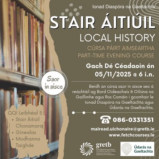 Gach De Ceadaoin 5 Samhain 2025 @ 6 i.n. - Ionad Cuimhneacháin na nImirceach, Carna - Gaillimhe Cúrsa Stair Áitiúil in Ionad Cuimhneacháin na nImirceach, Carna - Cúrsa páirt aimseartha ☎️ 086 033 1351 mairead.uichonaire@gretb.ie