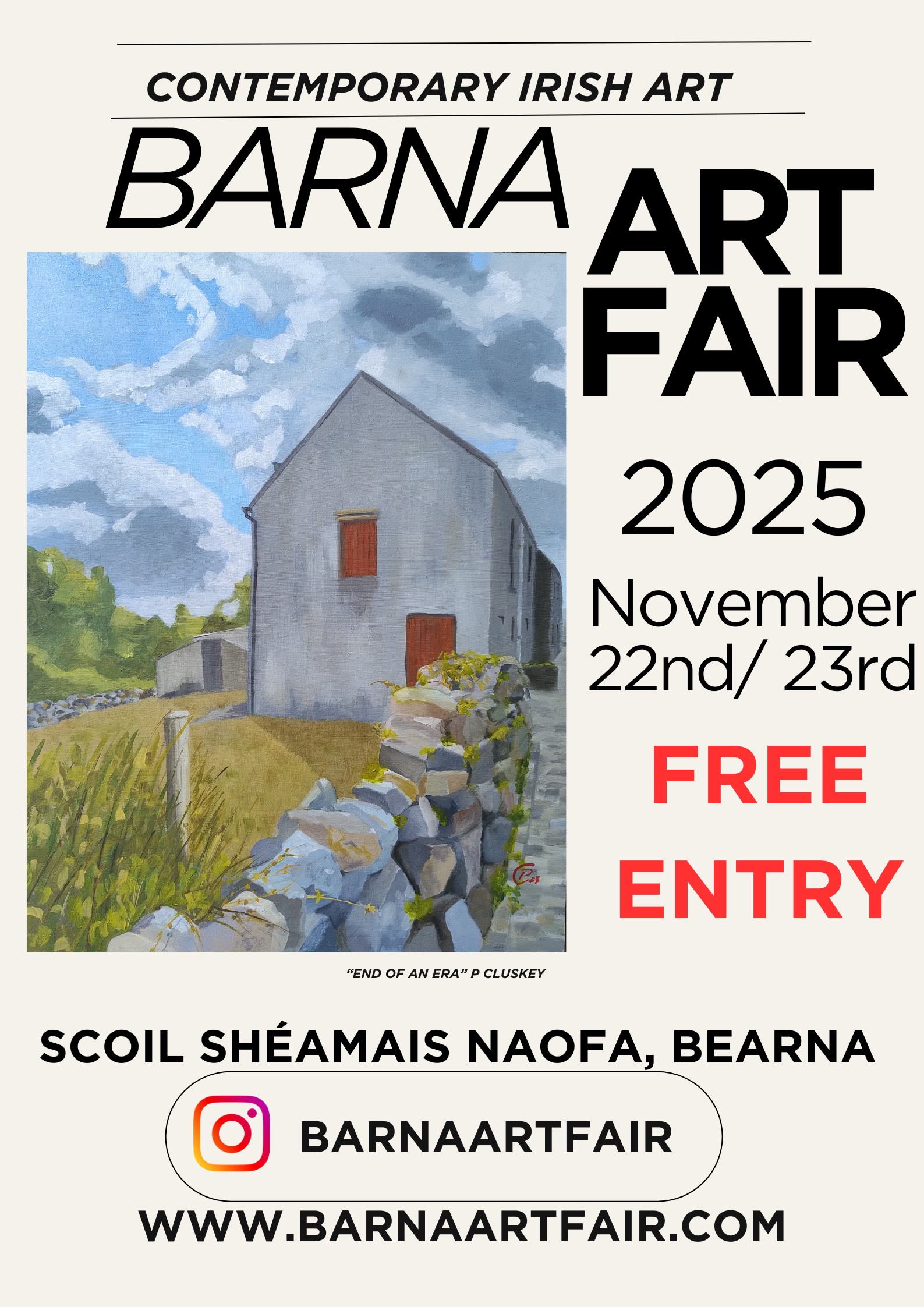 Saturday 22nd & Sunday 23rd November 2025 10am – 6pm Scoil Shéamais Naofa, Freeport, Bearna, Co. Galway H91 X2X8 We’re delighted to announce the Barna Art Fair 2025, now in its second year, celebrating the best of contemporary art from the West of Ireland—just in time for Christmas shopping. Discover a vibrant mix of paintings and mixed media creations from talented local artists. With free entry and a raffle with some amazing pieces of art, it’s the ideal way to support Irish art and find something truly special this holiday season. Free Entry and Free Parking on site.