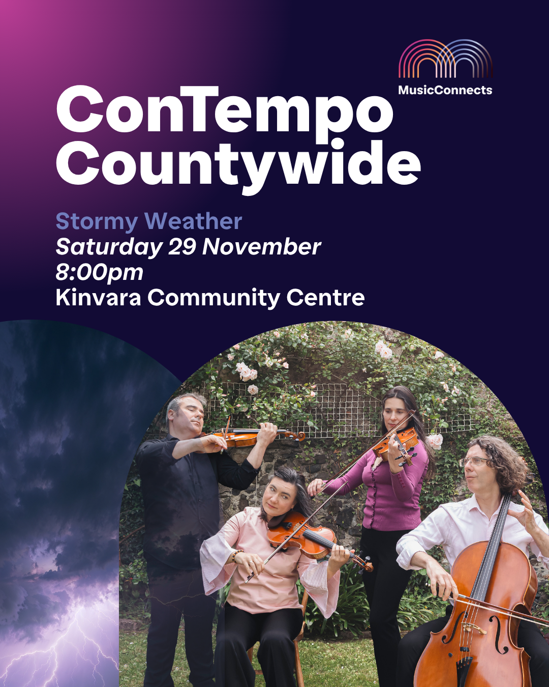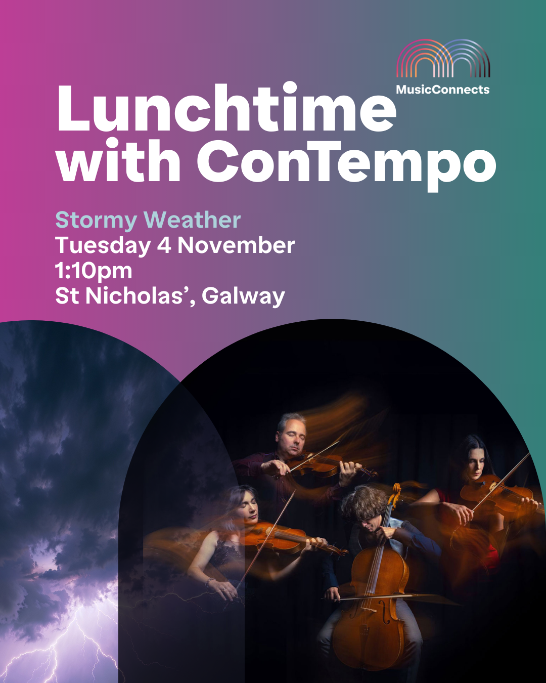 Tuesday 4 November 2025 at 1:10pm St Nicholas' Collegiate Church, Galway Catch MusicConnects' 'Stormy Weather' concert! Entry to the concert is FREE and all are welcome. Donations are gratefully accepted, no booking required. Lunchtime with Contempo takes place on the first Tuesday of the month. MusicConnects is proudly supported by the Arts Council of Ireland, University of Galway, Galway City Council and Galway County Council. For further information, visit: musicconnects.ie