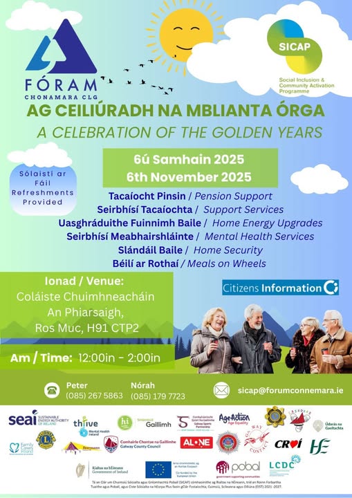 Déardaoin 6ú Samhain 2025 12:00in - 2in Coláiste Chuimhneachain An Phiarsaigh Ros Muc H91 CTP2 Le haghaidh tuilleadh eolais déan teagmháil Peter 085 267 5863 - Norah 085 179 7723