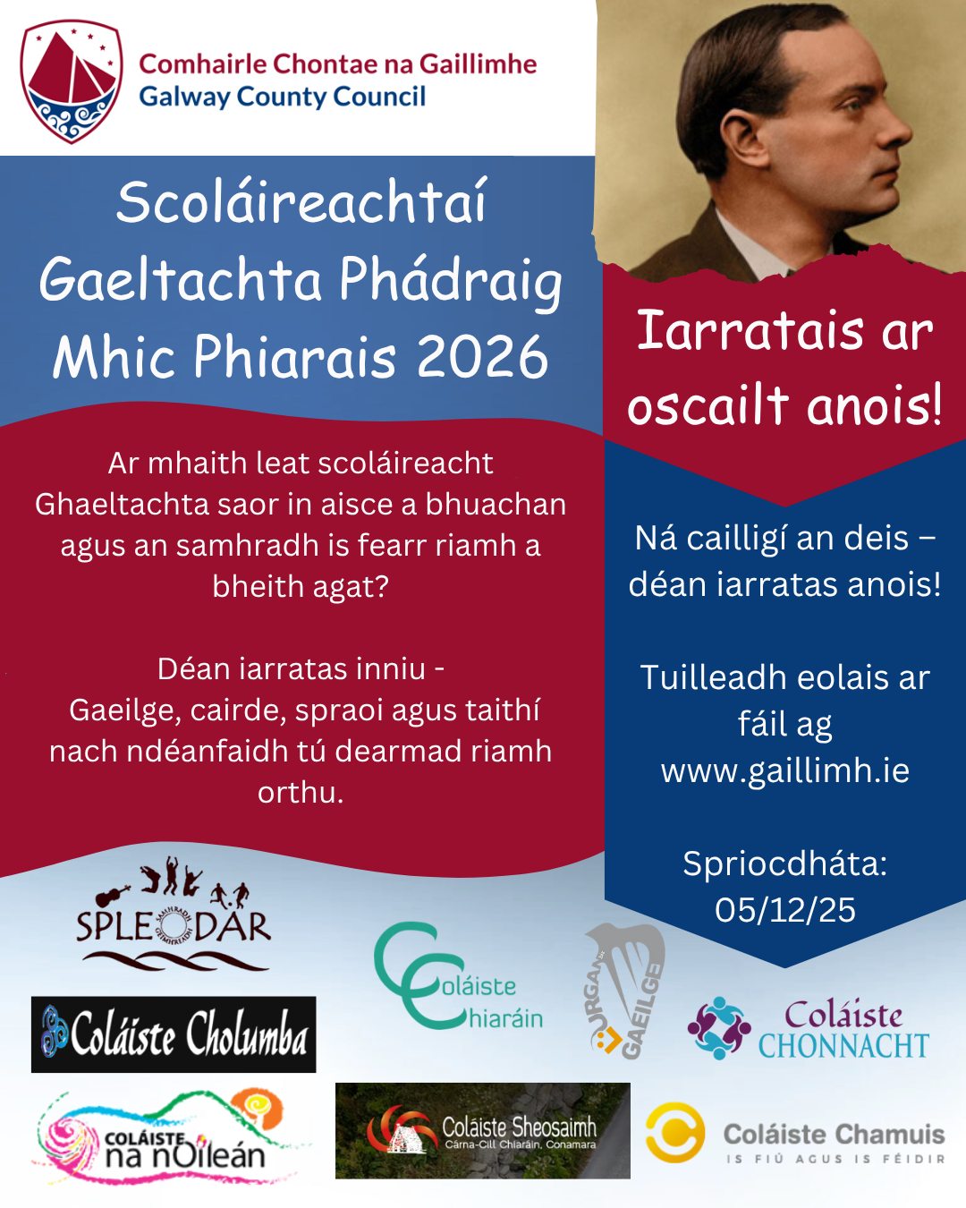 Spriocdháta: Dé hAoine 5 December 2025 An bhfuil grá agat don Ghaeilge? Buaigh scoláireacht Ghaeltachta! Tá iarratais oscailte anois do Scoláireachtaí Gaeltachta Phádraig Mhic Phiarais 2026! Ar mhaith leat samhradh lán de spraoi, cairdeas agus Gaeilge a chaitheamh? Déan iarratas inniu le bheith sa seans scoláireacht Ghaeltachta a bhuachan. Tuilleadh eolais ar fáil ag: https://www.gaillimh.ie/.../iarratais-oscailte-anois...