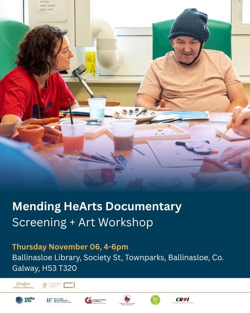 Thursday 6th November 2025, 4pm - 6pm Ballinasloe Library, Ballinasloe Co. Galway H53 T320 Join us for a special screening of a new short documentary about the Mending HeArts project, and stay for an art workshop. The film showcases a series of personal stories, featuring the voices of patients, artists, and healthcare staff. It captures the impact of art, fostering wellbeing, community connection, and emotional expression. Following the screening, all guests are invited to take part in a hands-on art workshop, a relaxed and welcoming session, guided by artists from the project. No experience needed, just curiosity and creativity. Free event. All welcome. Light refreshments will be served. Link to register: https://shorturl.at/8wPvj