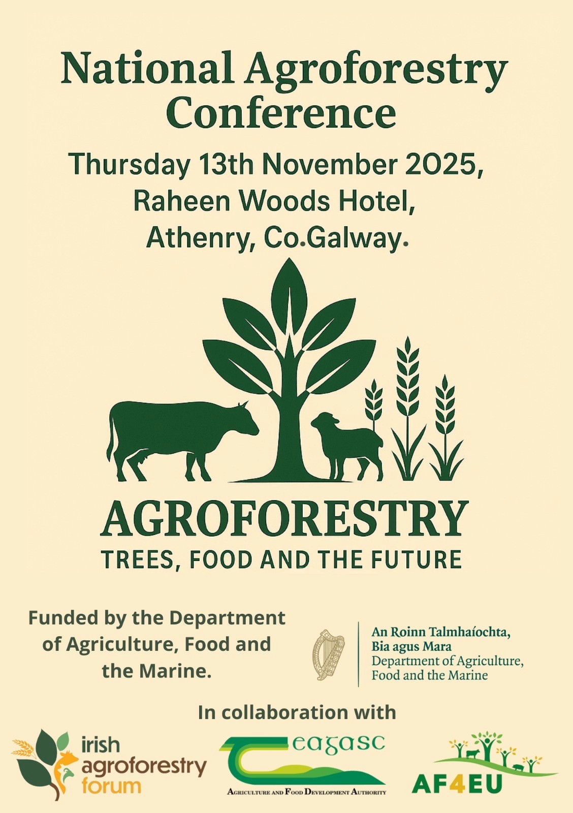 Thursday 13th November 2025 9.30am Raheen Woods Hotel, Athenry, Co.Galway Are you curious about how agroforestry can shape the future of farming on the island of Ireland? The upcoming Agroforestry Conference will bring together farmers, experts, and innovators to explore the agricultural components of agroforestry systems - from management and design to business models and long-term potential. Hear directly from leading experts - researchers and farmers who are making agroforestry work on the ground. Learn about agroforestry as part of the farm enterprise, added revenue opportunities and practical examples of profitable systems. How trees on farms can enhance productivity, biodiversity, and resilience. This is a must-attend event for farmers, landowners, researchers, and anyone interested in the future of farming for resilience on the island of Ireland. Register here: https://www.irishagroforestry.ie/agroforestryconference