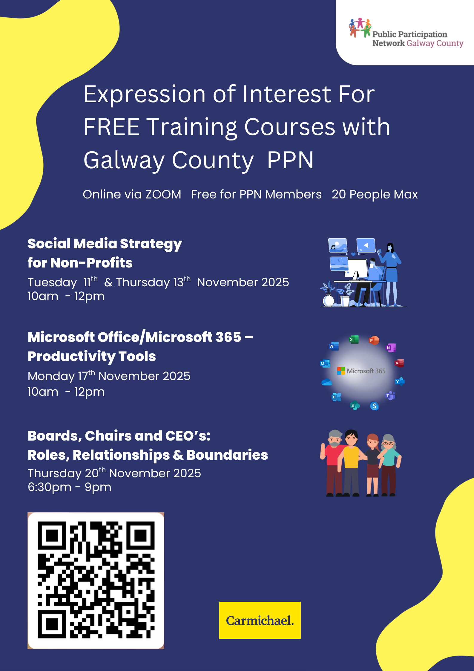 Galway County PPN is delighted to share the latest PPN Training Series with Carmichael Training Centre. This series of 3 online course trainings for community groups are: Social Media Strategy for Non-Profits: Tuesday 11th & Thursday 13th November 2025, 10am – 12pm Microsoft Office Microsoft 365 Productivity Tools: Monday 17th November 2025, 10am – 12pm Chairs and CEO’s Roles, Relationships & Boundaries: Thursday 20th November 2025, 6:30pm – 9pm For more info and registration visit https://www.galwaycountyppn.ie/ppn-training-series-november-2025/