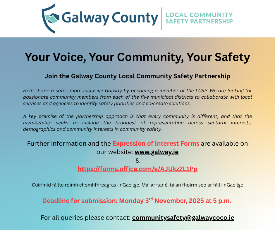 Deadline: Monday 3rd November 2025 at 5 p.m. Join the Galway County Local Community Safety Partnership. Further information and the Expression of Interest Forms are available on our website www.galway.ie & https://forms.office.com/e/AJUkz2L1Pp Cuirimid fáilte roimh chomhfhreagras i nGaeilge. Má iarrtar é, tá an fhoirm seo ar fáil i nGaeilge. For all queries please contact: communitysafety@galwaycoco.ie