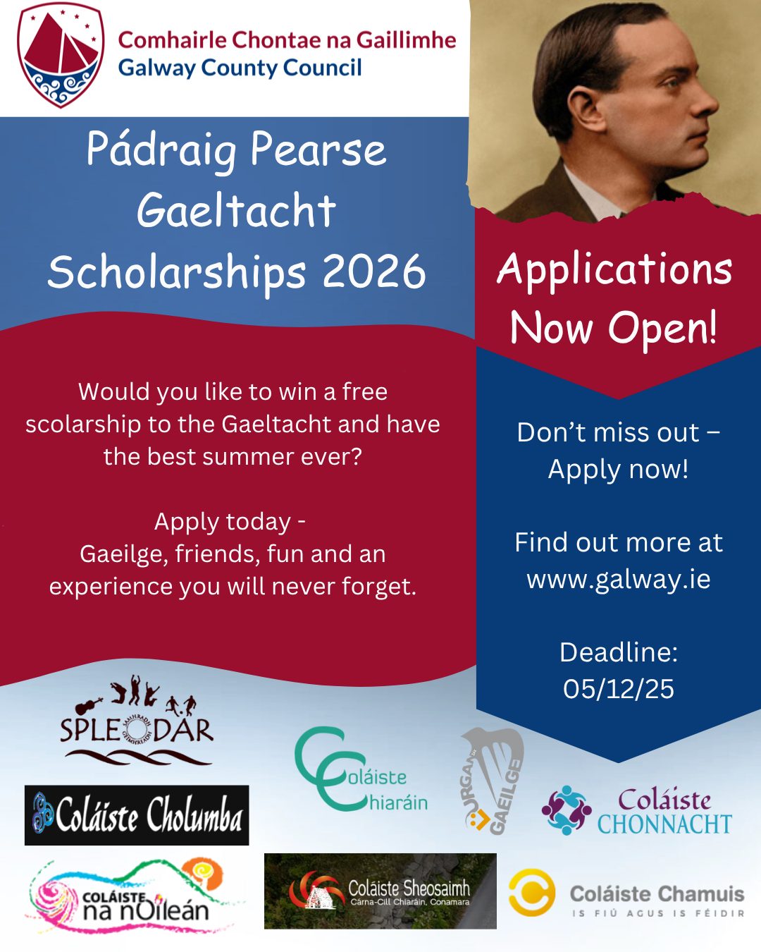 Deadline: Friday 5 December 2025 Galway County Council is now inviting applications for the 2026 Pádraig Pearse Gaeltacht Scholarships. The scholarships give students the opportunity to attend a fully funded Gaeltacht summer college course in Connemara, where they can improve their Irish language skills while enjoying a range of engaging activities. Applications in Irish are welcome. More information available at: https://www.gaillimh.ie/.../applications-now-open-padraig...