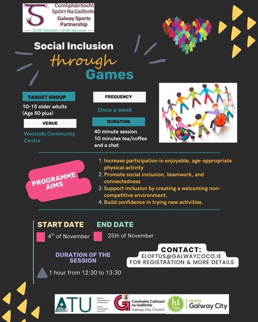 Starting Tuesday 4th November 2025 for 4 weeks 12:30 – 13:30 Westside Community Centre, Galway New Older Adult Program Alert!! Join us for a fun and engaging 4-week program designed especially for older adults. Social Inclusion Through Games combines light physical activity with enjoyable group games to help you stay active, meet new people, and feel connected within the community. This program is open to all fitness levels no experience is needed. The focus is on movement, laughter, and social inclusion in a friendly, welcoming space. For more information contact: eloftus@galwaycoco.ie Booking is essential https://www.eventbrite.ie/.../social-inclusion-through...