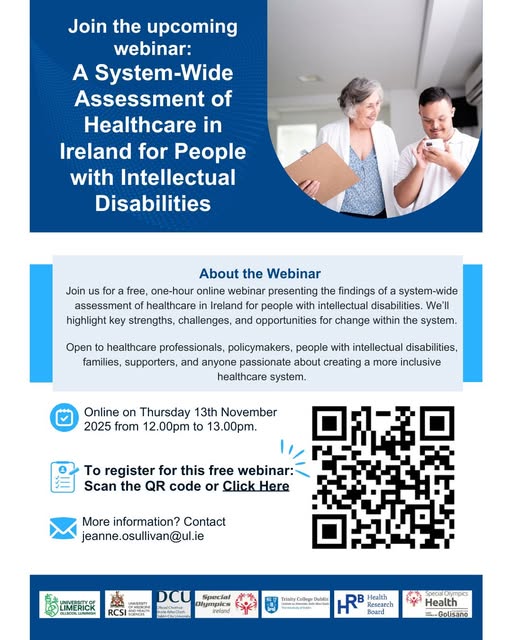 Thursday 13th November 2025 12.00 - 13.00pm Online Calling all healthcare professionals, policymakers, people with intellectual disabilities, families, and supporters! The webinar will present findings from phase one of Ireland’s Rosemary Collaboratory Project https://www.specialolympics.org/.../focusing-on-the..., which involved an in-depth examination of the inclusiveness of Ireland’s healthcare system for people with intellectual disabilities. This promises to be of interest to anyone passionate about building a better, more inclusive healthcare system in Ireland. To register for the webinar, click the link below or scan the QR code: https://forms.office.com/Pages/ResponsePage.aspx...