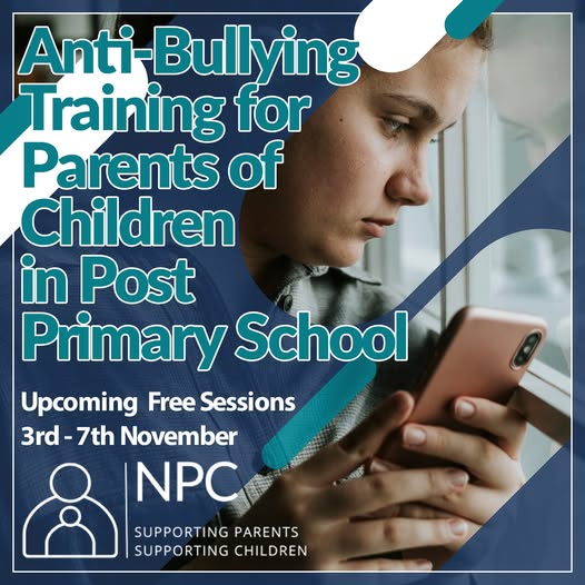 From Monday 3rd to Friday 7th November 2025 10am or 7:30pm (Mon-Thu) | 10am Friday Bullying can have a lasting impact on young people’s confidence, friendships, and emotional wellbeing — but parents can play a vital role in helping to prevent and respond to it. The sessions will enable you to support your child regarding issues of bullying and will also inform you about the Anti Bullying Procedures for Post Primary Schools. Register here: https://forms.office.com/e/skHuXR3Cd2