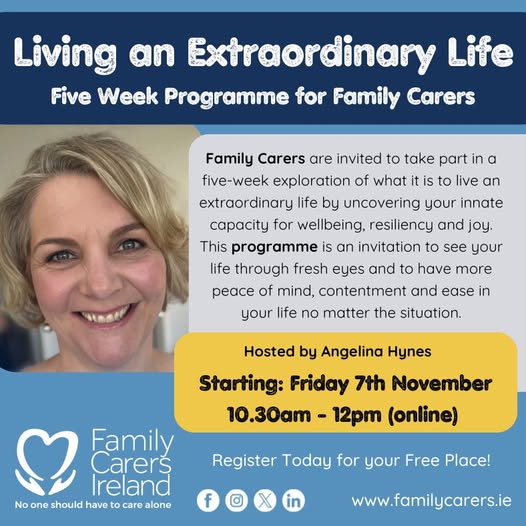 Starting on Friday 7th November 2025 10:30am - 12:00pm Online Join us from Friday 7th November at 10.30am as life and wellbeing coach, speaker and family carer Angelina Hynes returns with her five-week programme designed for family carers - Living an Extraordinary Life. Places are limited. Register at https://www.eventbrite.ie/e/1793975471929?aff=oddtdtcreator