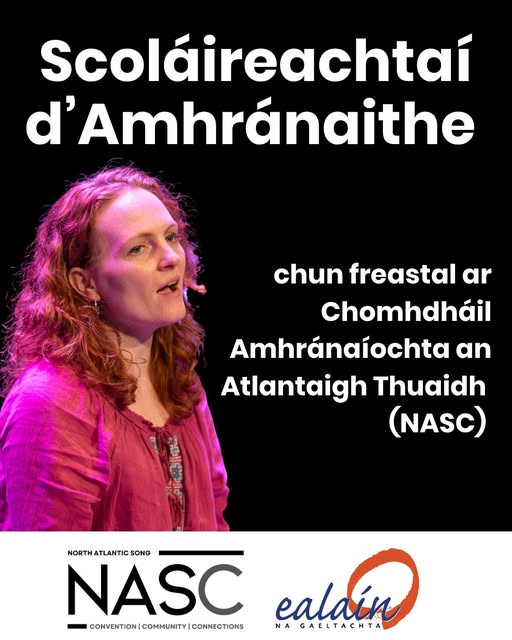 Spriocdháta ar iarratas a chur isteach: 21 Samhain 2025 Tá Comhdháil Amhránaíochta an Atlantaigh Thuaidh (NASC), i gcomhpháirt le hEalaín na Gaeltachta, ag fógairt líon teoranta scoláireachtaí d’amhránaithe atá lonnaithe sa Ghaeltacht in Éirinn, agus a chanann i nGaeilge, le freastal ar Chomhdháil NASC ó 6–8 Márta 2026 i nDún Éideann, Albain. Tá 3 scoláireacht ar luach €1,000 an ceann ar fáil chun tacú le costais chlárúcháin, taistil, lóistín agus per diem do na faighteoirí roghnaithe.Oscailte do dhaoine aonair atá 18 mbliana d’aois nó níos sine. Suíomh agus Dátaí: Ionad Scéalaíochta na hAlban, Dún Éideann, 6–8 Márta 2026 Tuilleadh eolais ar www.ealain.ie agus www.northatlanticsong.com