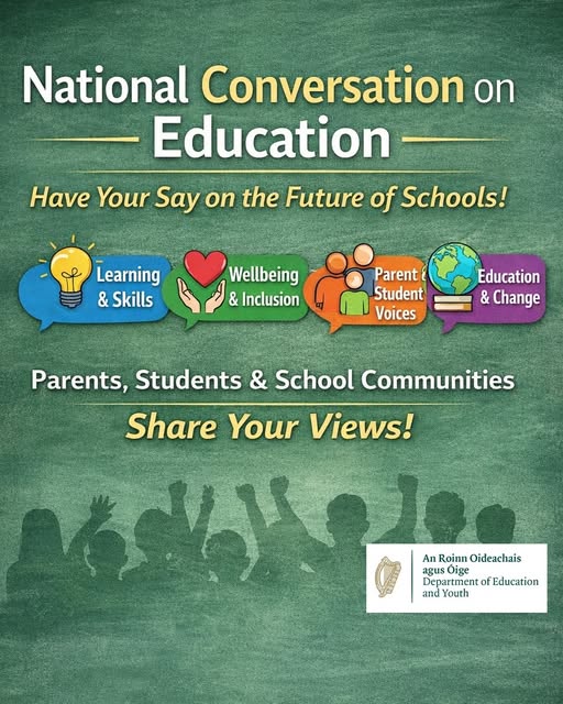 Closing date: Saturday 28th February 2026 The Department of Education has launched a National Conversation on Education, inviting parents, students, educators and wider school communities to share their views on the future of education in Ireland. The initiative aims to create space for open and inclusive dialogue about how education can best meet the needs of children and young people. Engagement will take place through events, discussions and public input. Read more This is a once-in-a-generation opportunity for children, young people, parents, educators and wider society to help shape Ireland’s education system for decades to come. If you need 𝐬𝐮𝐩𝐩𝐨𝐫𝐭 around engaging with education policy, school issues or representing parents’ views, the National Parents Council Helpline is here to help. 01 887 4477 www.npc.ie