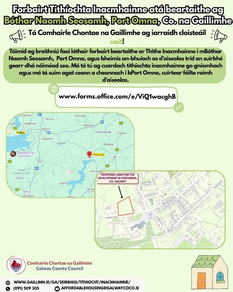 Comhairle Contae na Gaillimhe ag breithniú faoi láthair forbairt beartaithe ar Thithe Inacmhainne i mBóthar Naomh Seosamh, Port Omna, agus bheimis an-bhuíoch as d’aiseolas tríd an suirbhé gearr dhá nóiméad seo. Má tá tú ag cuardach tithíochta inacmhainne go gníomhach agus má tá suim agat ceann a cheannach i bPort Omna, cuirtear fáilte roimh d'aiseolas. Glac an suirbhé anseo