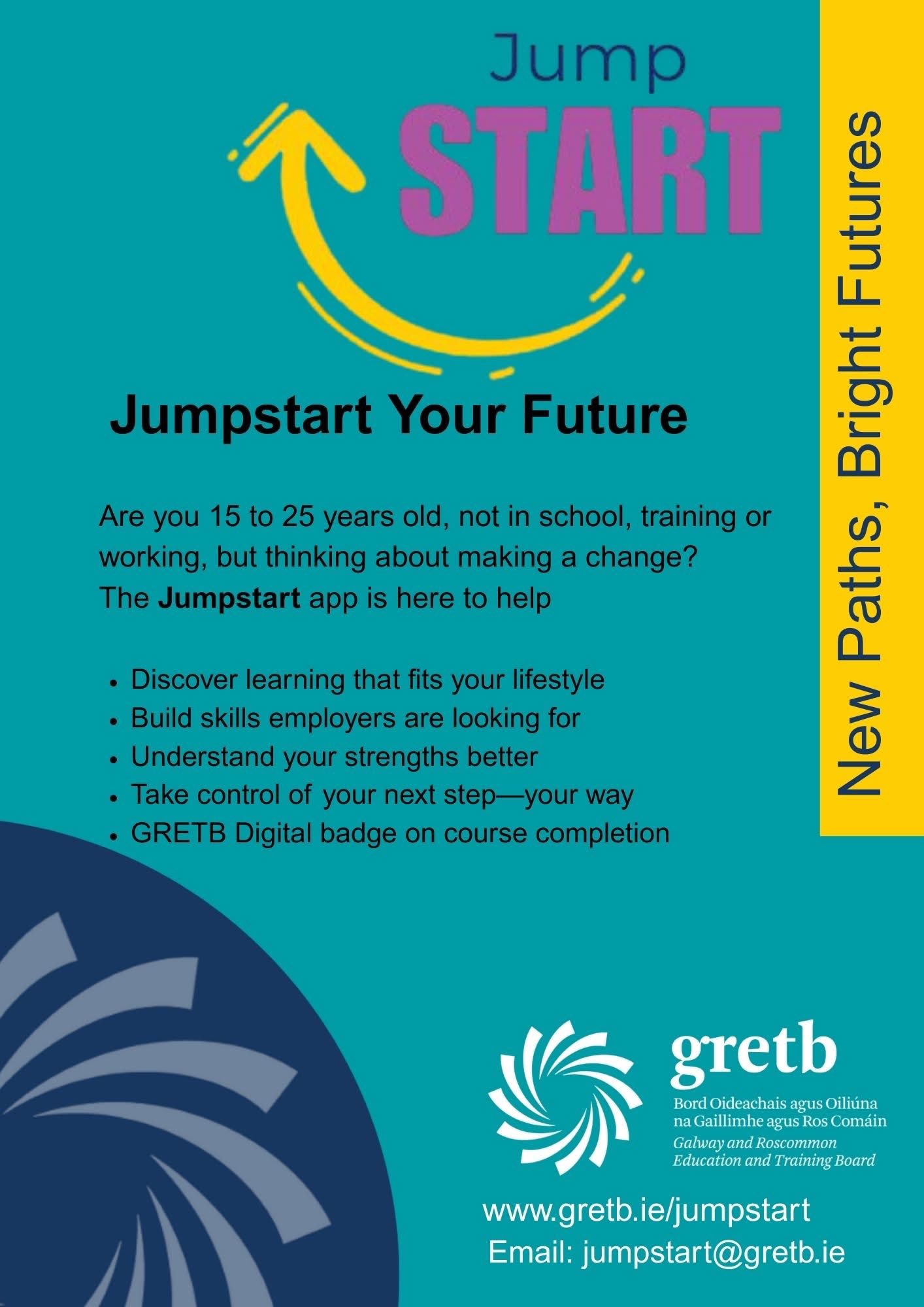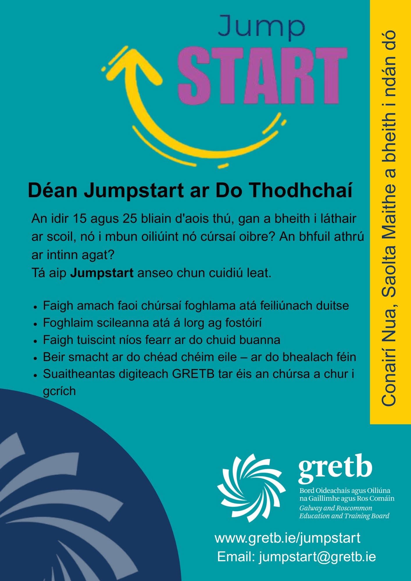 Is tionscnamh foghlama digiteach nua é ‘Jumpstart’ atá forbartha ag GRETB chun tacú le daoine óga idir 15 agus 25 bliana d’aois nach bhfuil i mbun cúrsaí oideachais ná oiliúna faoi láthair. Cuirtear Jumpstart ar fáil trí aip shoghluaiste, is féidir le rannpháirtithe atá cláraithe rochtain a fháil ar fhoghlaim ag am a oireann dóibh féin. Níl aon scrúduithe ná tascanna foirmiúla ann; ina ionad sin, iarrtar ar fhoghlaimeoirí gealltanas a thabhairt go mbeidh siad rannpháirteach go gníomhach san ábhar. Tuilleadh eolais anseo: https://gretb.ie/ga/jumpstart/ nó seol ríomhphost chuig: jumpstart@gretb.ie