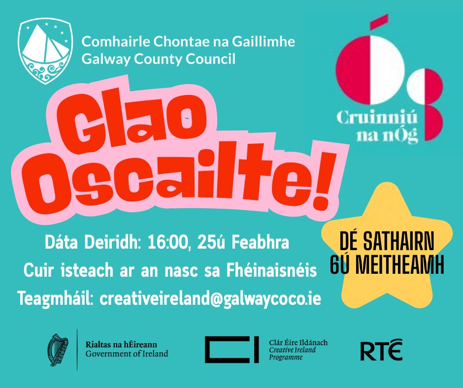 Spriochdháta: Dé Máirt 03ú Feabhra ag 4i.n. Tá iarratais á lorg ag Oifig Ealaíon Chontae na Gaillimhe ó ealaíontóirí aonaracha chun a gcleachtas ealaíona agus a ngairm ealaíne a fhorbairt. Cliceáil anseo le haghaidh treoirlínte agus foirm iarratais na Scéim Tacaíochta d’Ealaíontóirí: https://galwaycoco.submit.com/show/145